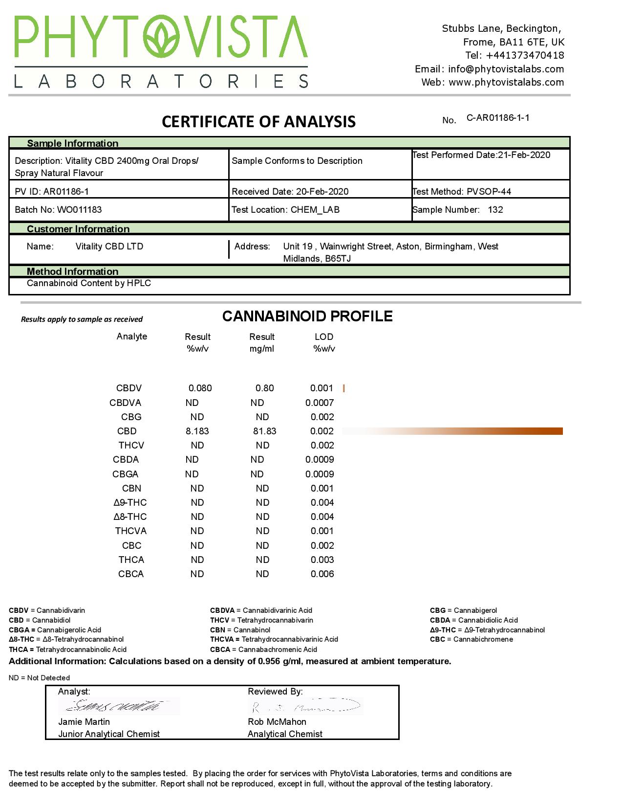 Specification: Vitality CBD – 30ml – 8% (Natural, Lemon or Berry)